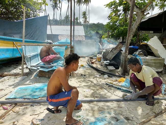 Along with tending commodity and staple crops, fishing is an important activity sustaining the livelihoods of Parigi villagers. Their everyday routines revolve around fishing. They will sail out to sea at daybreak. When they return, their wives will already be waiting on the shore to help carry their equipment and bring in the catch. At home, they will converse with fellow fishermen about fishing and prepare their tools. Fishermen form groups to assemble fish traps that cannot be assembled by a single individual. As a group, they maintain the regulation of fishing rules.