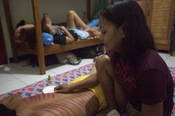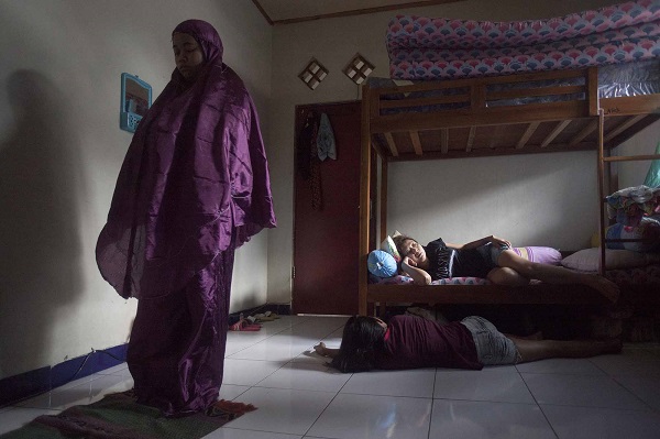 A client gives another client a traditional Indonesian massage in their room at the end of a typical day. At PEKA, female clients share a room and live in close quarters with each other, which helps build a more intimate and secure environment, as shown here. The lack of female-specific drug treatment programs in Indonesia is one of the many barriers stopping women from seeking help they need. PEKA is one of the very few drug rehabilitation centres in Indonesia doing that.