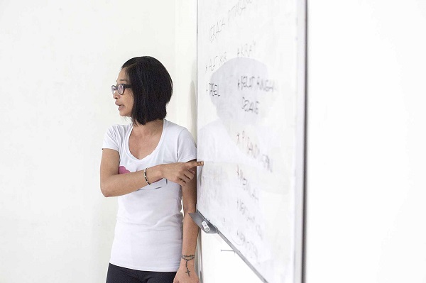 Another employed client speaks during the daily learning session, in which clients learn about drug dependency management and other life skills. The activities teach sustainability through development of life skills, including running a laundry service, raising fish and growing vegetables. Their contributions also allow the centre to be financial independent.