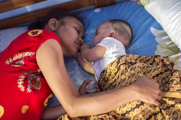 A client sleeps with her baby. She had lived with HIV for many years and became a client in 2012. Her first baby was born HIV positive and died shortly after birth. The baby in the photograph is her second child, who was conceived after HIV treatment and careful monitoring. At six months, having received the right support, her baby is healthy.
