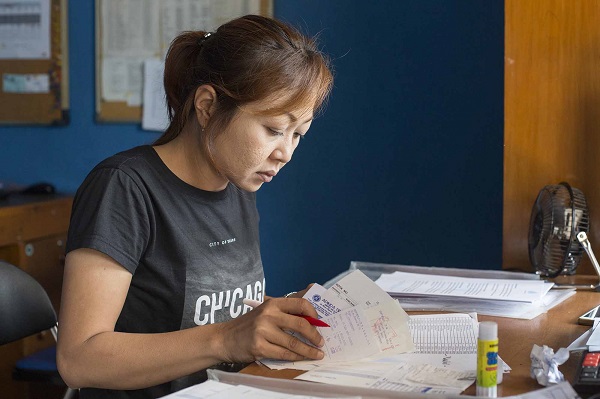 A former client completes the financial reporting for the rehabilitation centre at the end of the month. After she had been a client for two years, PEKA employed her as their financial officer. Nearly 90 per cent of centre employees are former clients.
