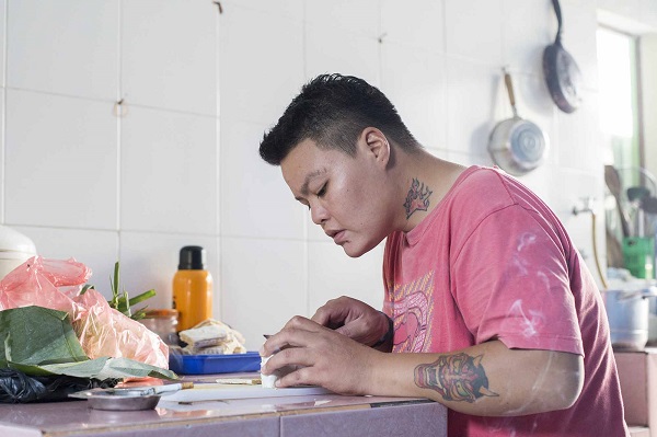 A client cooks dinner to share with the rest of the community at PEKA. Clients take turns preparing meals for one another on a rolling roster, such that everyone has a chance to prepare food twice a week.